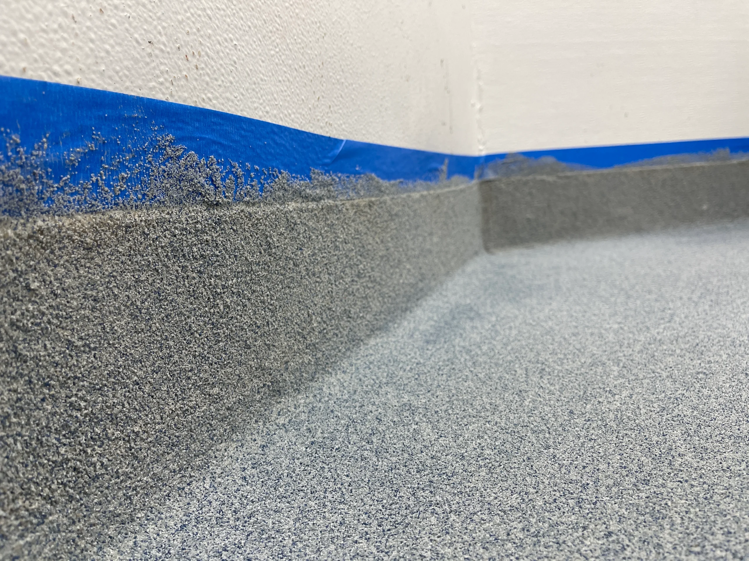 Colored quartz granules are broadcast into the wet base coat until full coverage is achieved.